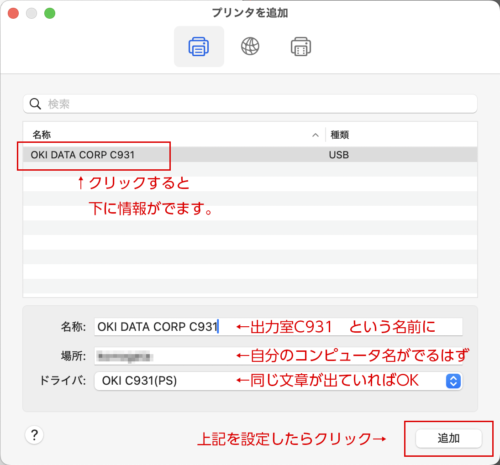 ※「ドライバ:」が「一般的なPostscriptプリンタ」などになる場合は、ドライバがきちんとインストールされていないので、[1.ドライバーをダウンロード][2.ドライバーをインストール]からもう一度ドライバを入れなおしてください。